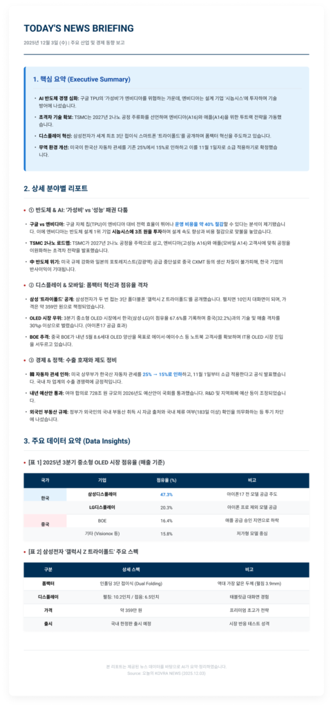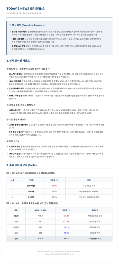 - 한국 반도체 산업은 미중 경쟁 속에서 기술 경쟁력 강화와 미국 투자 확대를 통해 위기를 극복하고 새로운 기회를 모색해야 한다.