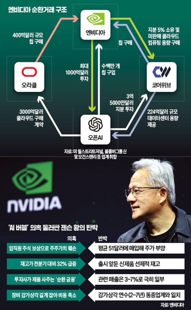 오픈AI 주요 투자사인 스라이브캐피털의 자회사에 오픈AI가 투자한다는 소식도 논란에 기름을 부었다. 불투명한 지분 관계와 순환 거래에 따른 의혹은 향후 추진할 IPO에서 걸림돌이 될 가능성이 크다. 이날 전해진 엔비디아의 ‘1000억 달러 계약 미확정’ 소식은 오픈AI의 추가 투자 유치 속도가 늦춰지고 있다는 점을 시사한다.